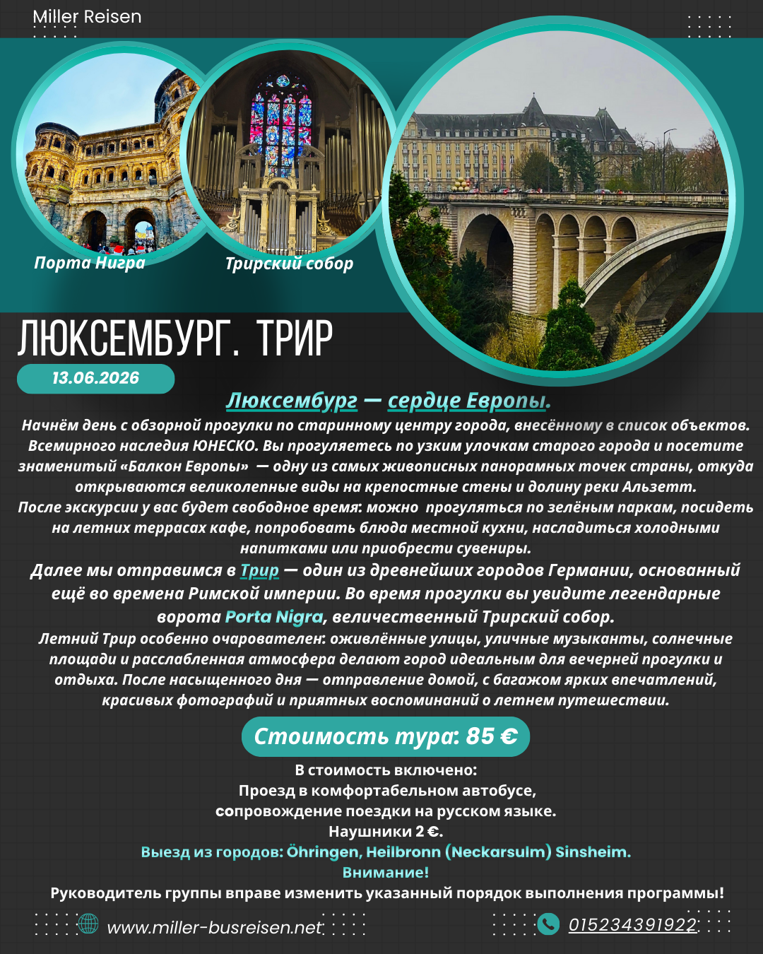 Летний Трир особенно очарователен: оживлённые улицы, уличные музыканты, солнечные площади и расслабленная атмосфера делают город идеальным для вечерней прогулки и отдыха. После насыщенного дня — отправление домой, с багажом ярких впечатлений, красивых фотографий и приятных воспоминаний о летнем путешествии.