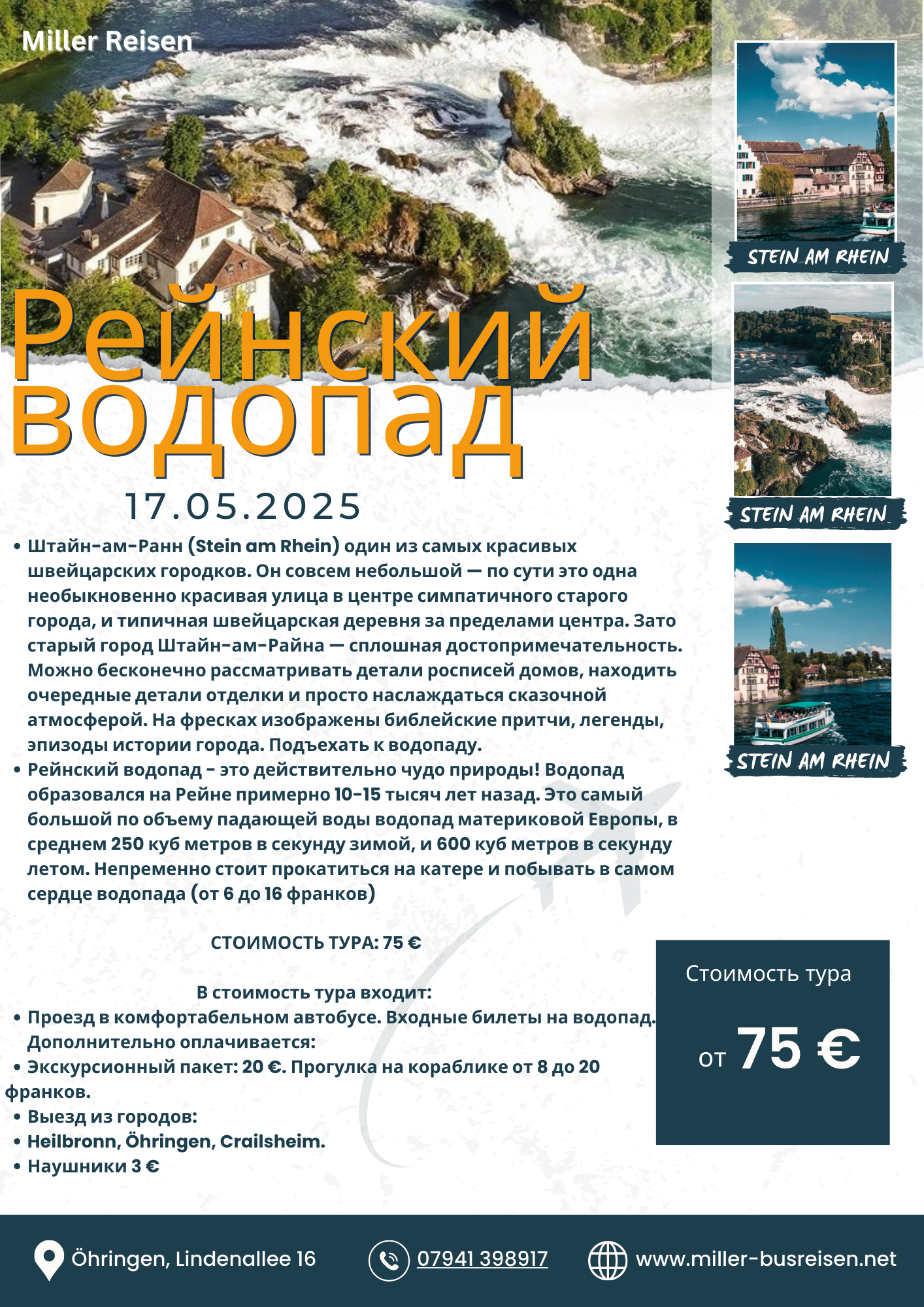 Штайн-ам-Ранн (Stein am Rhein) один из самых красивых швейцарских городков. Он совсем небольшой — по сути это одна необыкновенно красивая улица в центре симпатичного старого города, и типичная швейцарская деревня за пределами центра. Зато старый город Штайн-ам-Райна — сплошная достопримечательность. Можно бесконечно рассматривать детали росписей домов, находить очередные детали отделки и просто наслаждаться сказочной атмосферой. На фресках изображены библейские притчи, легенды, эпизоды истории города. Подъехать к водопаду.