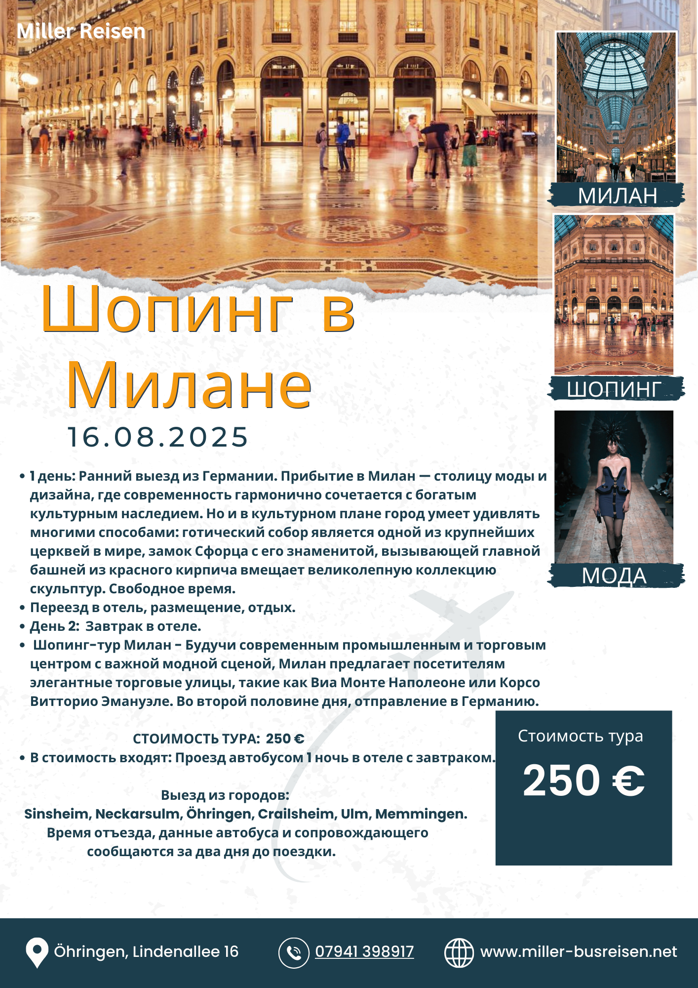 Шопинг-тур Милан - Будучи современным промышленным и торговым центром с важной модной сценой, Милан предлагает посетителям элегантные торговые улицы, такие как Виа Монте Наполеоне или Корсо Витторио Эмануэле. Во второй половине дня, отправление в Германию.