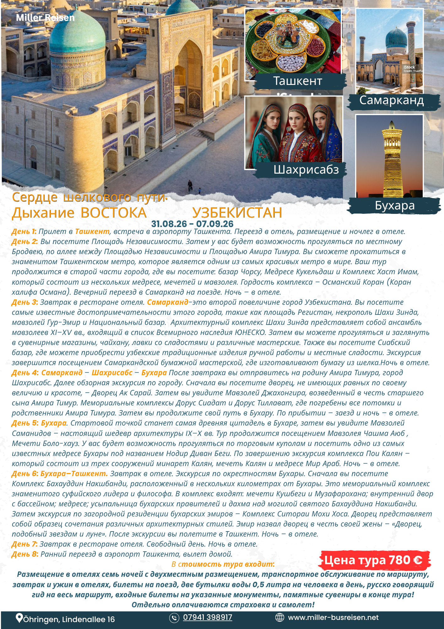 в сувенирные магазины, чайхану, лавки со сладостями и различные мастерские. Также вы посетите Сиабский